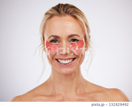 Skincare, eye pads and woman in studio with beauty, self care and natural face treatment. Cosmetic, dermatology and portrait of mature female model with anti aging facial treatment by gray background