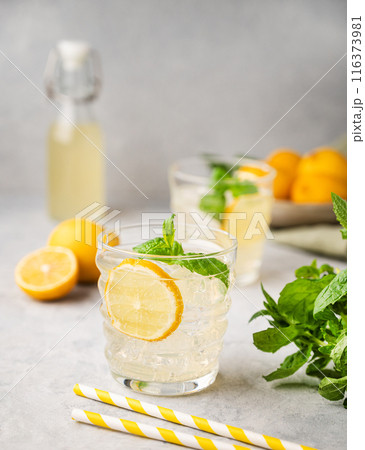 Lemonade soda drink with fresh lemons. Refreshing cocktail with lemon, mint and ice