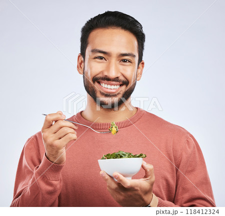 Fruit, portrait and happy asian man in studio for health, wellness and detox on grey background. Breakfast, salad and face of guy nutritionist smile for healthy, clean or raw diet for vegan lifestyle
