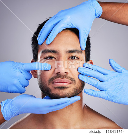 Plastic surgery, hands and drawing with portrait of man and surgeon for needle and syringe placement. Skincare, face and dermatology of a male person with medical procedure and collagen in studio