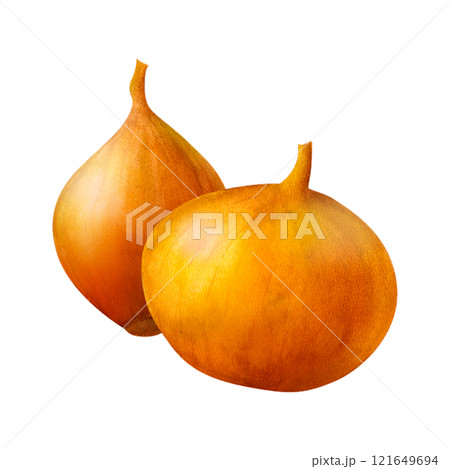 Yellow onion, watercolor garden vegetable illustration. For prints on textile and paper, clothes, plates and dishes design, decoration for kitchen, restaurant menus, recipes, cookbook.