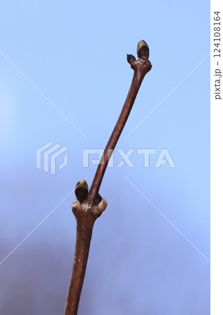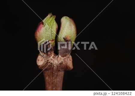 自然 植物 ミツバウツギ、芽吹き。三月半ば、二枚の芽鱗を割って緑色の若葉が顔を出しました