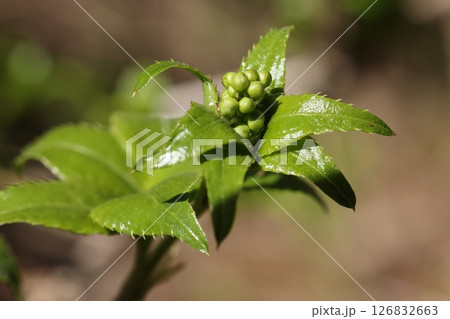自然 植物 ミツバウツギ、四月。芽吹いた若葉の真ん中に蕾が覗いています