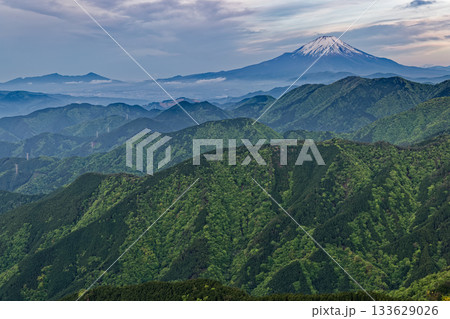丹沢表尾根・三ノ塔から見る朝の富士山と新緑の山並み