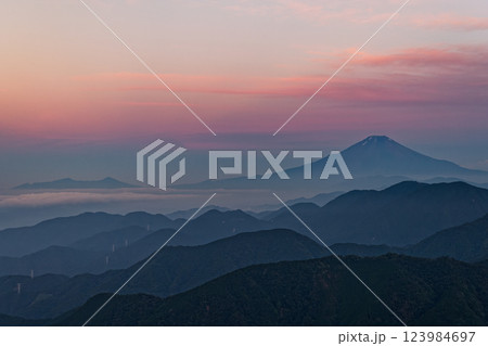 夏の丹沢表尾根・三ノ塔から見る朝焼け空と富士山