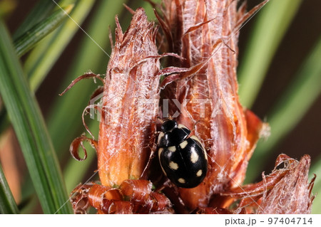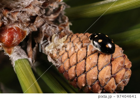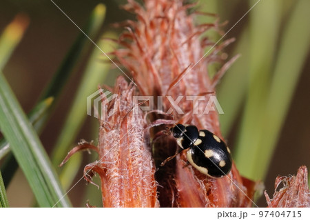 生き物 昆虫 ムツキボシテントウ、大きさは三ミリ半ほど。冬の松林で比較的よく見かけるかな