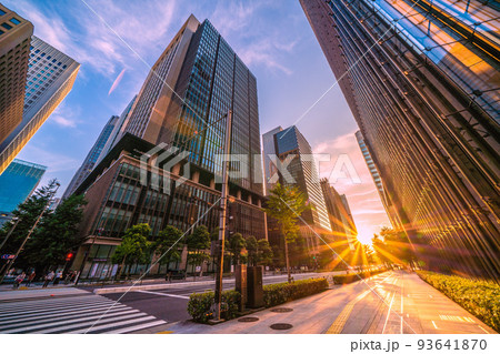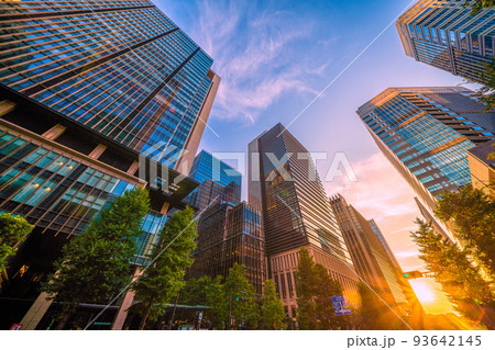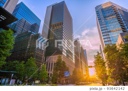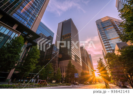 日本の東京都市景観 大手町側から新緑と夕日を浴びる丸の内のオフィスビル群などを望む