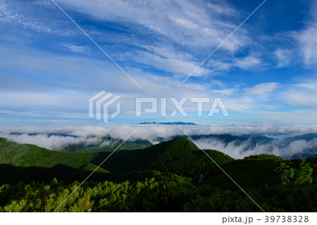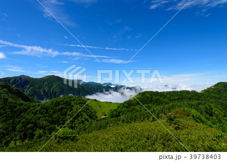 南アルプス塩見岳山頂からの 中央アルプス 木曽駒ヶ岳、宝剣岳、御嶽山 遠景
