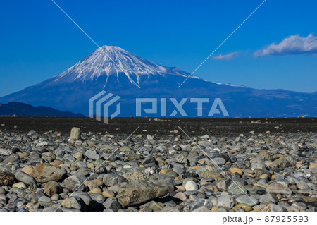 三保海岸の砂利に富士山