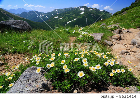 北アルプス飛騨山脈 双六岳の登山道から見たチングルマと三俣蓮華岳、水晶岳、鷲羽岳