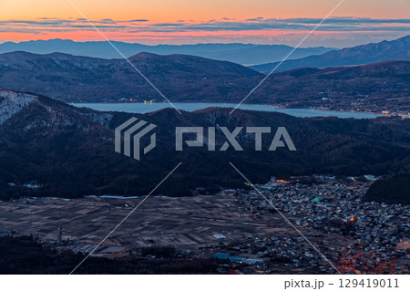 忍野・杓子山から見る夜明けの山中湖と伊豆の山並み