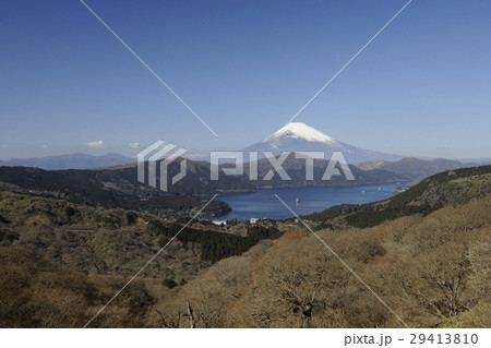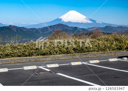 神奈川県の箱根大観山の駐車場から望む富士山と芦ノ湖