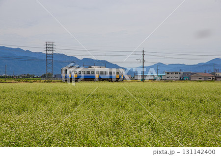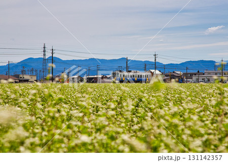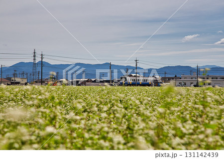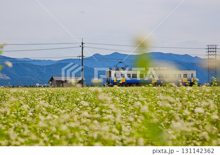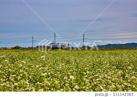 そば畑の中を走るえちぜん鉄道