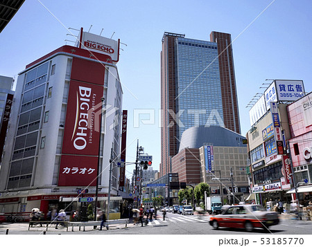 日本の東京都市景観 三軒茶屋駅世田谷通り口や大山道道標などを望む