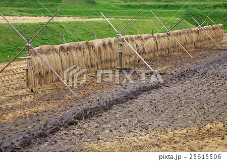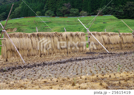 稲穂 天日干し はで干し 稲木干し 快晴 青空
