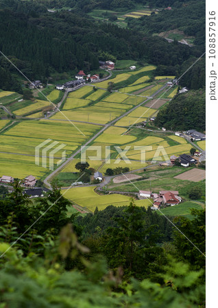 栗イガと三河内の棚田 稲刈り前 三つ子山からの眺望秋 黄金の稲穂