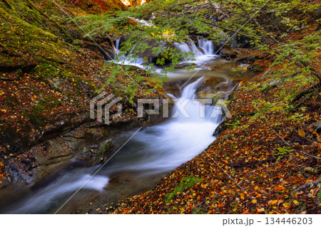 山梨県山梨市三富川浦 笛吹川の上流に位置する西沢渓谷のハイキングコースからの紅葉の七ツ釜五段の滝