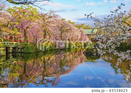 三嶋大社の満開の枝垂れ桜と水面に映える景観