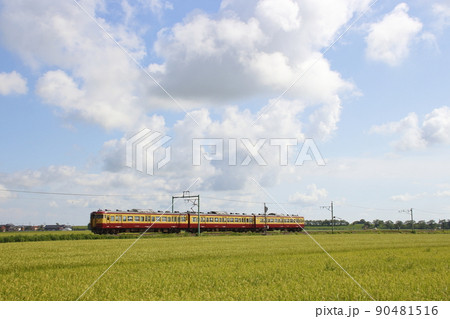 田植え準備の水田と越後線115系(懐かしの新潟色)