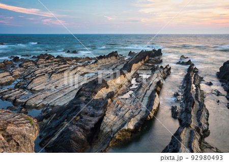 夕暮れの荒崎海岸 夕焼け空と波打ち際の風景