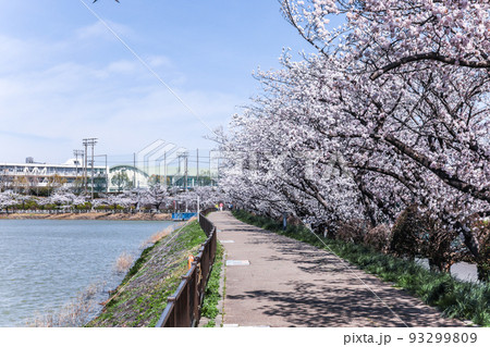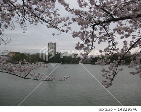 三崎池(三崎水辺公園)の噴水と満開の桜