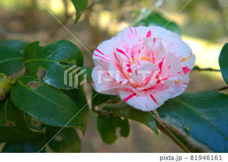 小鳥の森(三徳園) 白に紅の斑入り八重咲きのツバキの花 岡山県岡山市東区