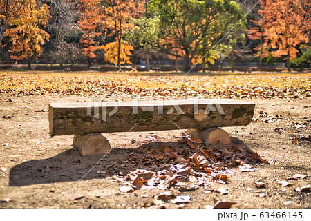 小鳥の森(三徳園) 丸太椅子に落ち葉一枚2 岡山県岡山市東区