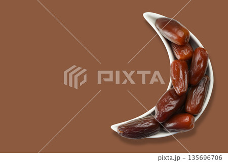 Dates placed in a crescent-shaped bowl for Ramadan festivity