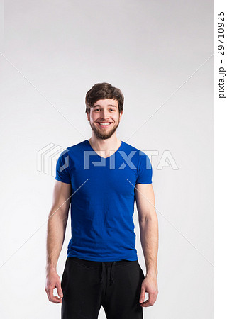 Handsome fitness man in blue t-shirt, studio shot.
