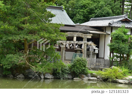 京都市上京区の京都御苑内の嚴島神社 九條池から見る唐破風鳥居
