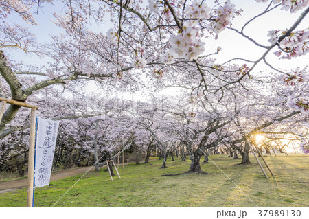 風光明媚の地で仙台市民に親しまれて朝日に包まれる桃源郷のような三神峯公園満開のソメイヨシノ
