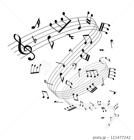 螺旋状にひろがる楽譜:五線譜の周りを舞う音符のベクターイラスト