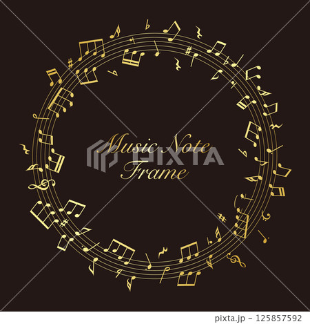 黒背景の楽譜のフレーム:円形の五線譜の周りを舞うに並ぶ金色の音符のベクターイラスト