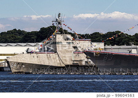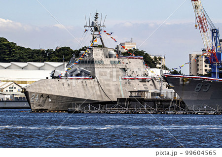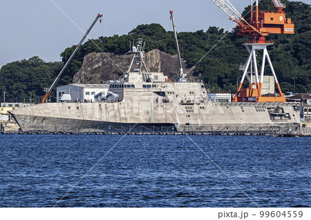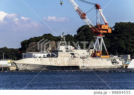 神奈川県横須賀市の横須賀基地に停泊し補給中のアメリカ海軍ステルス艦のオークランド