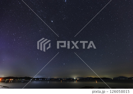 牡蠣棚並ぶ瀬戸内の海に昇るオリオン座