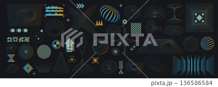 3D cyberpunk grid y2k wireframe icon mega set elements in flat graphic design. Bundle objects of futuristic geometric shape with cubes, perspective grids, tunnels, atoms, other. Vector illustration.