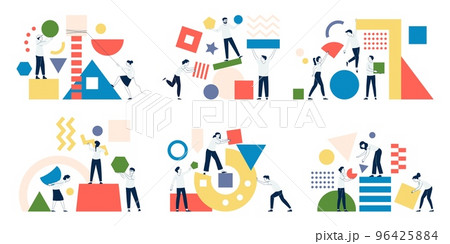 Collecting abstract color geometric shapes. Management, team work chaos metaphor. People working together, flat pair collect puzzle, recent vector scenes