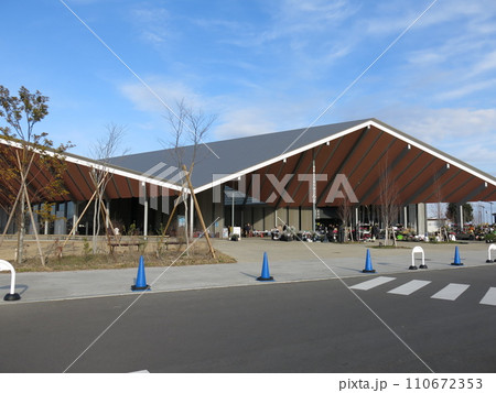 道の駅しょうなんの直売所棟「てんと」と芝生ひろば