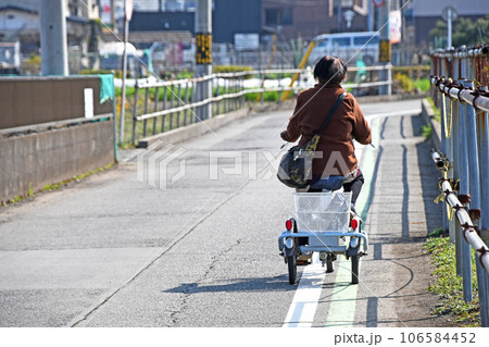 早春の日差しを浴びながら三輪自転車に乗るシニア