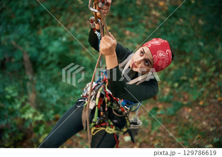 Focused on the climbing up. Woman is in the forest, using the safety equipment