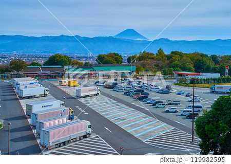 秋の山梨県甲斐市の中央自動車道下り線 双葉SAの展望塔からの眺望(富士山,上り線方面など)