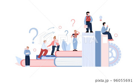 Different skill levels concept, tiny people climbing books - abstract flat vector illustration isolated on white.