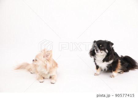 白い背景でお互い離れて座る仲の悪そうな二頭のロングコートチワワ