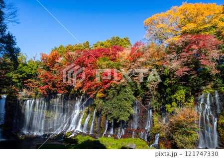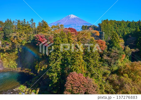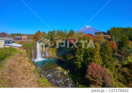 静岡県富士宮市上井出 世界遺産の富士山を背景に紅葉モミジが鮮やかな白糸の滝の景色