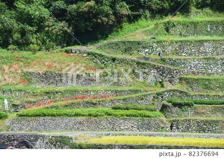 石積みの棚田に咲く