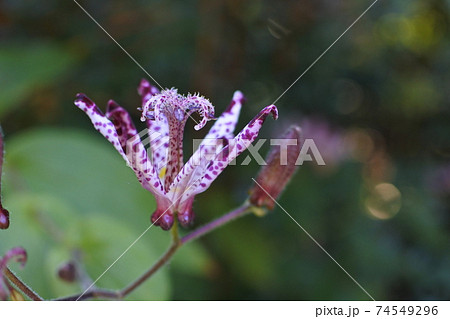 ホトトギス 白地に紫の斑点のある花一輪とつぼみ