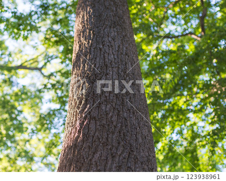 高く伸びる松の木々を見上げる構図 / 自然の荘厳さと静寂を感じる森林のビジュアル素材