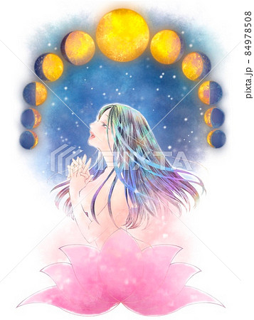 上を見上げてほほえむ女性/月の満ち欠けと蓮の花