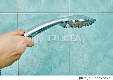 hands check the temperature of the shower water. a man's hand under a stream of water selective focus