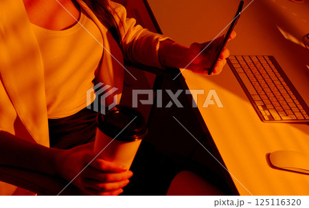 Woman Browsing Phone with Coffee at Desk in Warm Office Light.